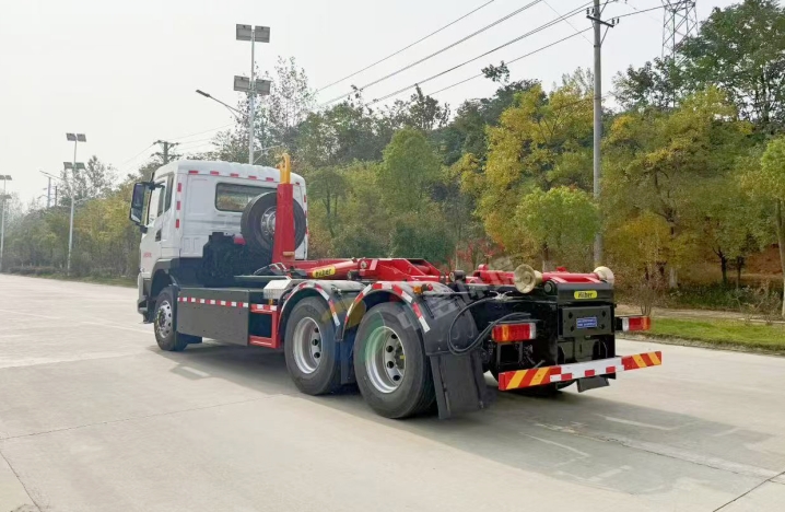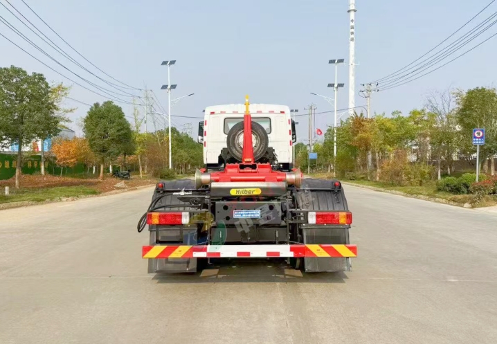 液压系统:主臂带伸缩功能,配备液压后支腿、横向锁紧装置及多路换向阀,支持钩臂式垃圾箱快速装卸。
